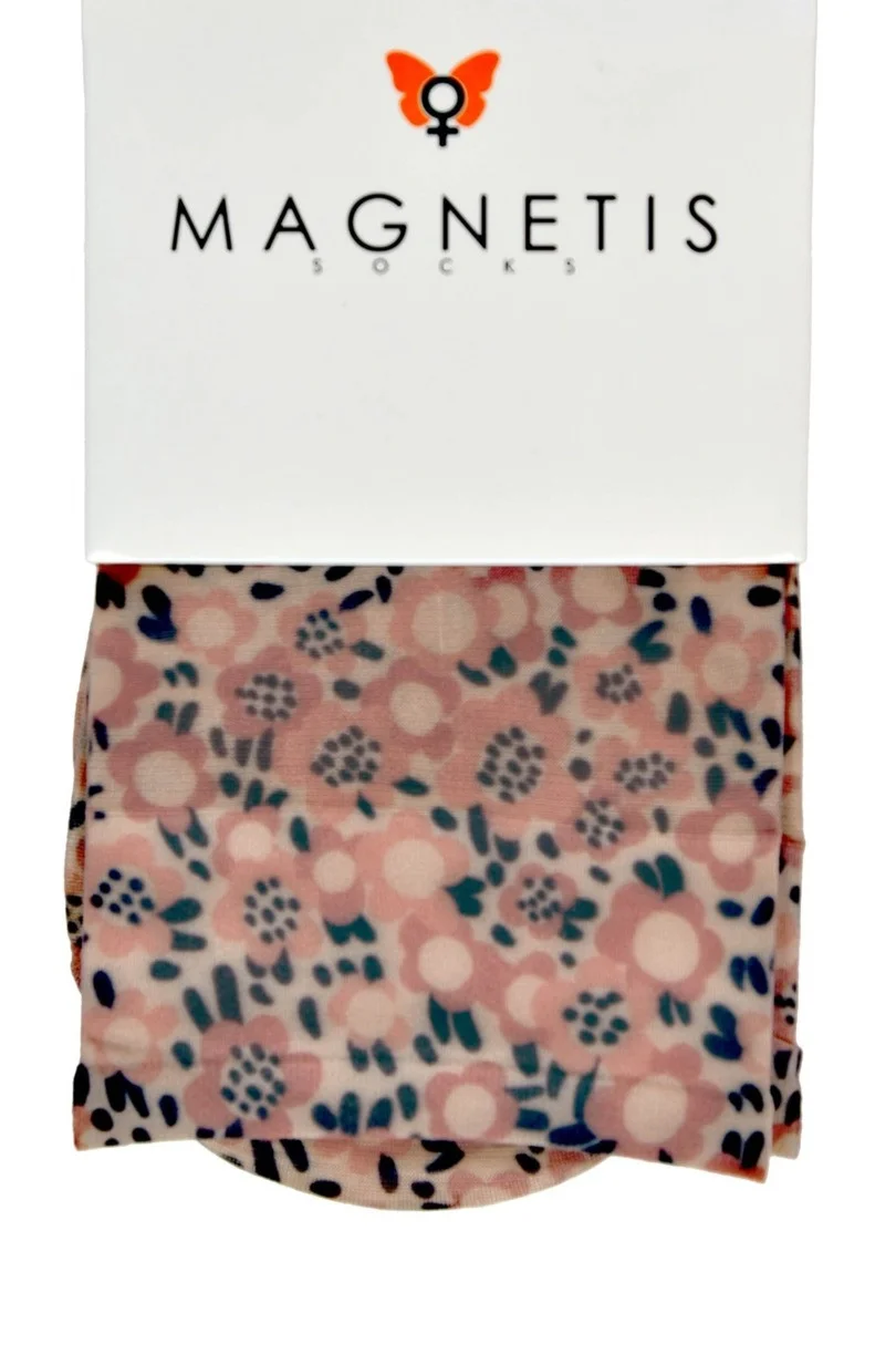 Model MODEL 102 od značky Magnetis je jemná, priehľadná ponožka s romantickým kvetinovým vzorom. Béžový základ zdobia pastelové kvetinové motívy v odtieňoch ružovej, tmavomodrej a zelenej farby, ktoré vytvárajú jemnú, ale výraznú kompozíciu. Vďaka hrúbke 12 denier a ľahkej štruktúre sú ponožky ideálne na teplejšie dni a hodia sa k balerínam, mokasínam alebo aj k lodičkám na podpätku. Vysoký obsah polyamidu a elastanu zaručuje dokonalé prispôsobenie a pohodlie pri nosení..