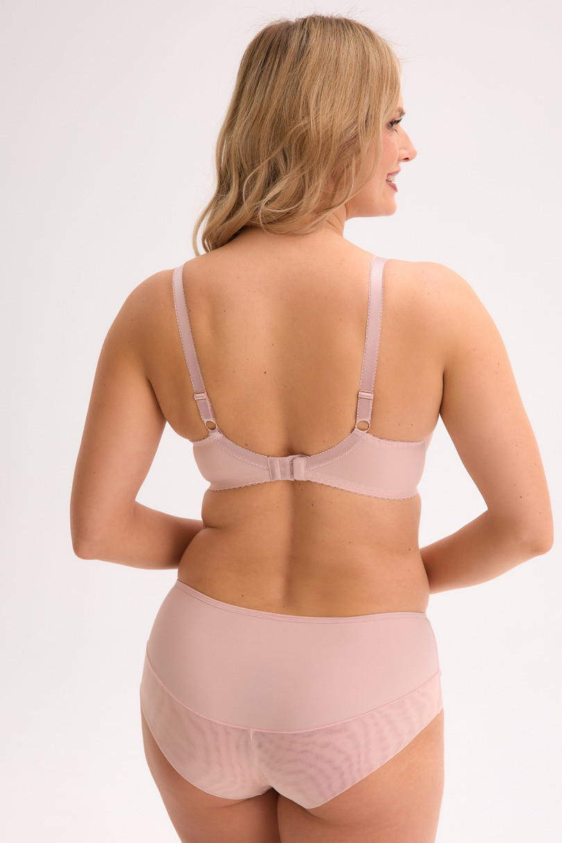 Tieto nohavičky s vysokým pásom v púdrovo ružovej farbe sú kombináciou jemnosti, ženskosti a pohodlia. Prednú časť modelu zdobí priehľadný tyl v kombinácii s jemnou levanduľovou čipkou, ktorá vytvára pôsobivý, zoštíhľujúci tvar písmena "V". Zadná časť je vyrobená z hladkého, elastického mikrovlákna, ktoré mäkko leží na tele a neprejavuje sa pod oblečením. Vysoký strih krásne modeluje siluetu a poskytuje pocit pohodlia a sebavedomia počas celého dňa. Drobná mašlička na prednej strane dodáva celku šarm. Ideálne na nosenie s podprsenkou z rovnakej línie ako elegantný komplet. Zloženie: 77 % polyamid, 13 % elastan, 10 % bavlna