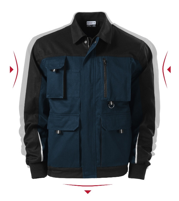 kostený zips po celej dĺžke s klopou na chrbte 8 multifunkčných vreciek mechové vrecká s klopou a vrecká na zips manžety rukávov z rebrového úpletu s 3 % elastanu spodný okraj s gumičkou na boku kovové "D" pútko na kľúče a doklady dvojité prešitie pre zvýšenú odolnosť reflexné prvky