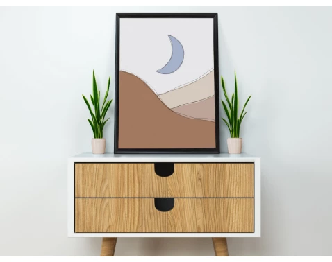 Obraz v čiernom ráme s motívom krajiny a mesiaca v škandinávskom a boho štýle vytvára útulnú atmosféru. Ideálny doplnok do obývačky, spálne alebo pracovne.