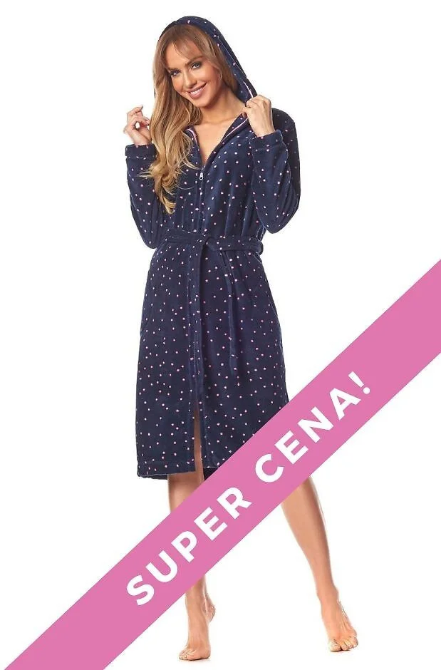 Dlhý a pohodlný dámsky župan - z mäkkého bodkovaného úpletu - s kapucňou - zips - jemná aplikácia na úrovni hrudníka - zviazané v páse - vrecká na bokoch Zloženie: 100% polyester
